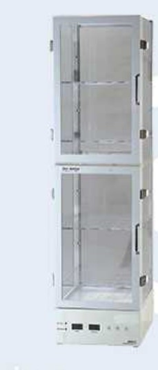 Laboratory Type Desiccator Cabinet Systems with Humidity, Temperature Display (Optionally, Temperature adjustment system can be integrated. Aluminum Body, Transparent PPMA Surface, Adjustable Height Stainless Steel Shelf Design.
