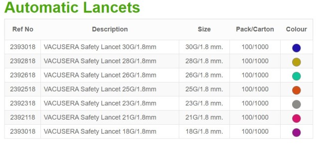 2393018 VACUSERA Safety Lancet 30G/1.8mm 30G/1.8 mm. 100/1000