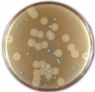 L. monocytogenes species form blue colonies surrounded by an opaque halo.