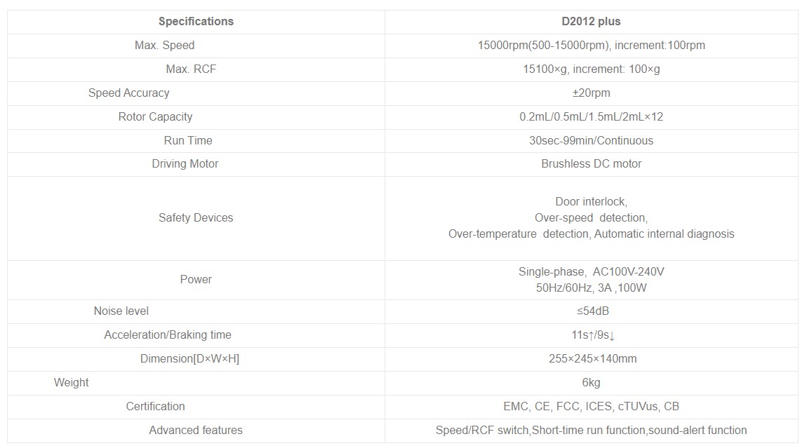 | 9032002121 | D2012 plus | High Speed Mini Centrifuge (CE marked), with A12-2P plastic rotor kit(select 19400010)(package contain in the box) | Euro plug, 220-240V/50Hz/60Hz |