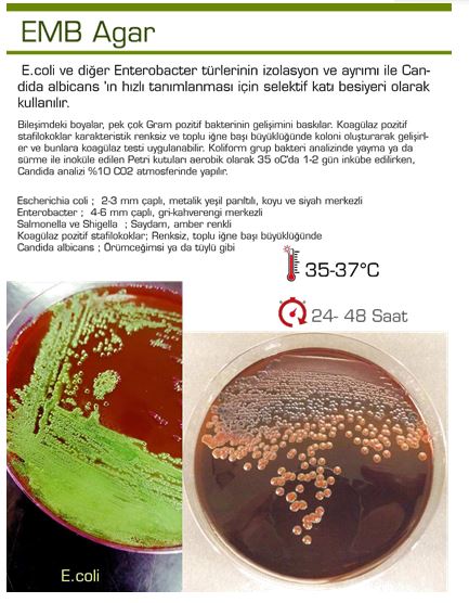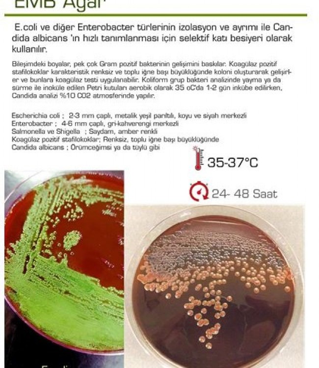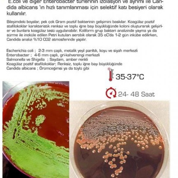 It is used as a selective solid medium for the isolation and differentiation of E.coli and other Enterobacter species and for rapid identification of Candida albicans.