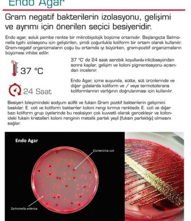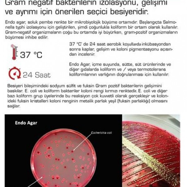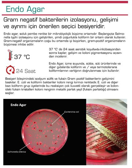 Endo Agar is used to confirm the presence of coliforms and/or thermotolerant coliforms in drinking water, milk, dairy products and other foods.