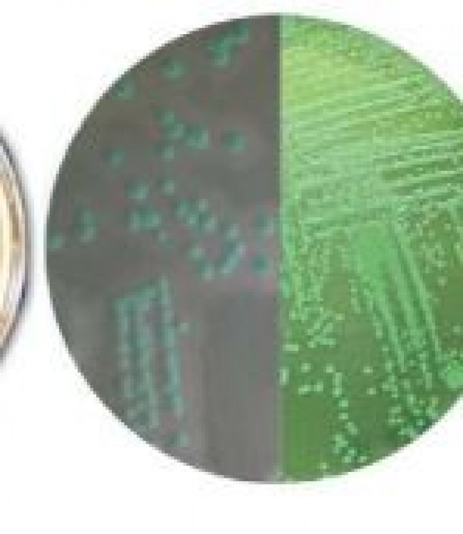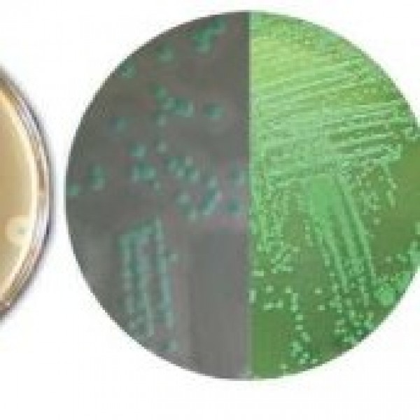 Typical colonies of L. monocytogenes are bluish green on the medium, clear around