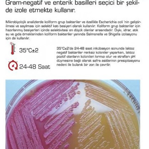 It is also used for isolation of Salmonella and Shigella as well as coliform bacteria from feces, urine, waste water and food samples.