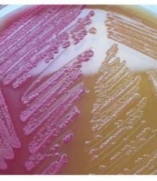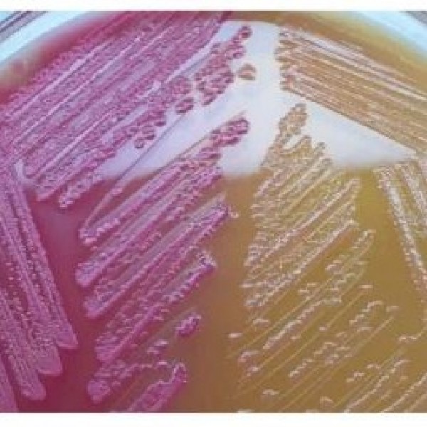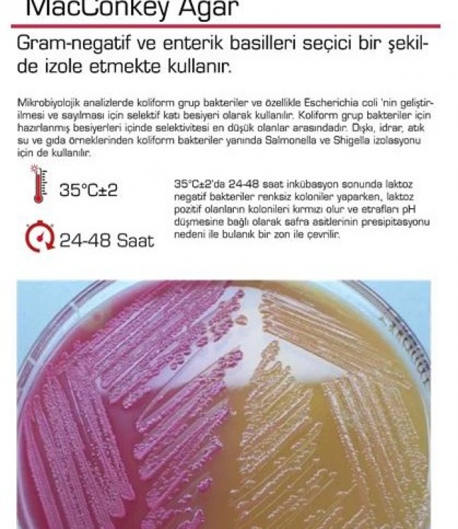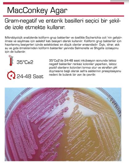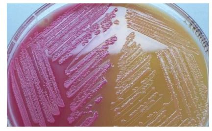 At the end of 18-24 hours incubation at 35 C, lactose-negative bacteria form colorless colonies, while lactose-positive colonies become red and surrounded by a turbid zone due to the precipitation of bile acids due to the decrease in pH.