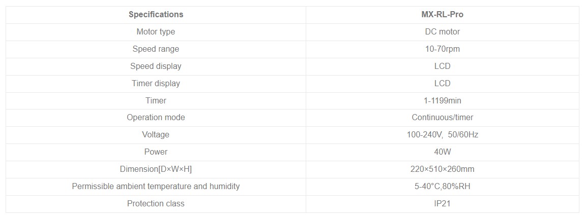 | 8031402100 | MX-RL-Pro | LCD Digital Rotator (including a 50ml rotisserie accessory - 18900147),used with rotisserie accessories,variable speed,adjustable mixing angle(package contain the box) | USA plug,100V-220V/50Hz/60Hz |