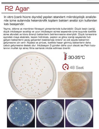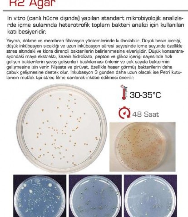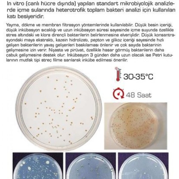It is a solid medium used for the analysis of heterotrophic total bacteria in drinking water in standard microbiological analyzes performed in vitro [outside the living cell].