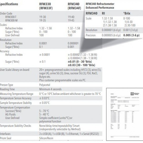 Measuring range: 1.32 - 1.58 RI, 0 – 100 °Brix, Resolution: 0.0001 RI, 0.1 °Brix