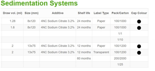 Ref No Description Draw vol. (ml) Size (mm) Additive Shelf life Label Type Pack/Carton Cap Colour