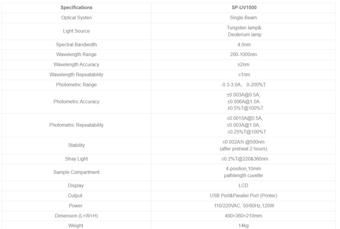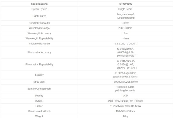 | 4010110100 | SP-UV1000 | 200~1000nm Tungsten lamp &Deuterium lamp, including 4 glass square cuvettes and 2 quartz square cuvettes(package contain) | 110/220 V AC, 50/60 Hz, 80 W |