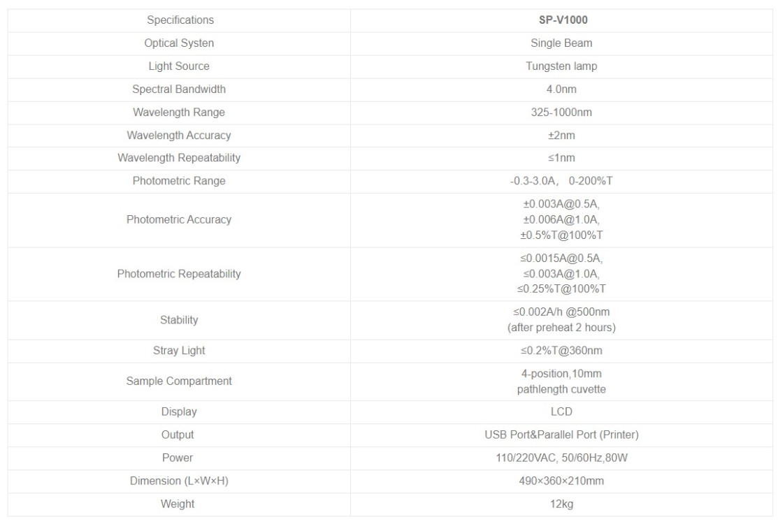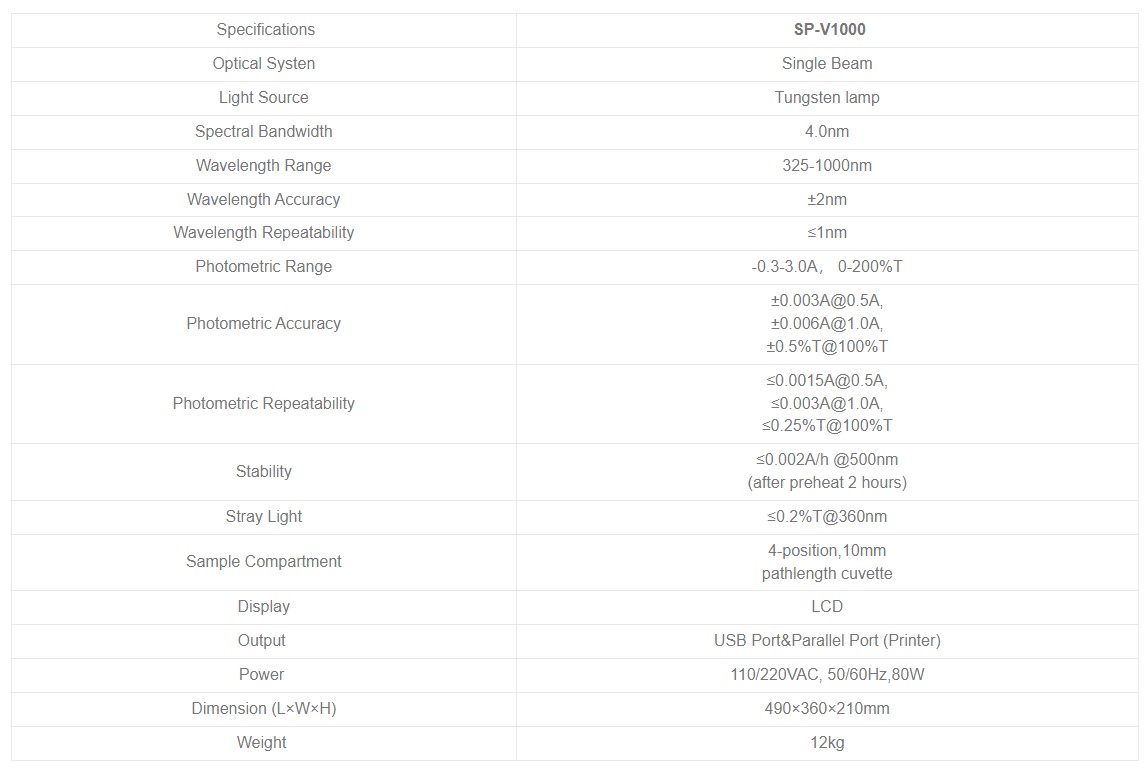 | 4010210100 | SP-V1000 | 325~1000nm Tungsten lamp, including 4 glass square cuvettes (package contain) | 110/220 V AC, 50/60 Hz, 80 W |