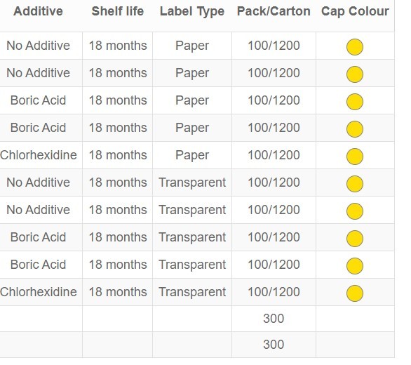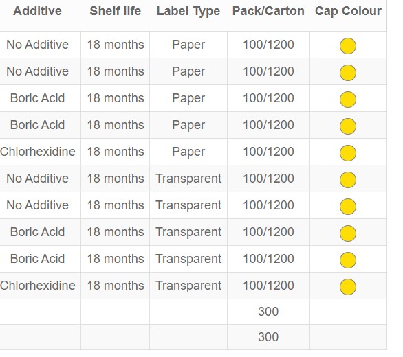 Ref No Description Draw vol. (ml) Size (mm) Additive Shelf life Label Type Pack/Carton Cap Colour