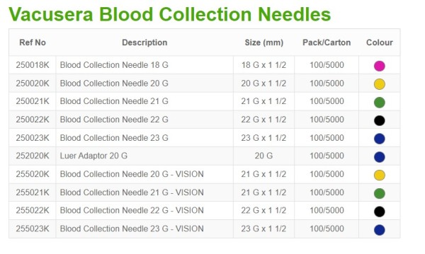 | 255020K | Blood Collection Needle 20 G - VISION | 21 G x 1 1/2 | 100/5000 | |